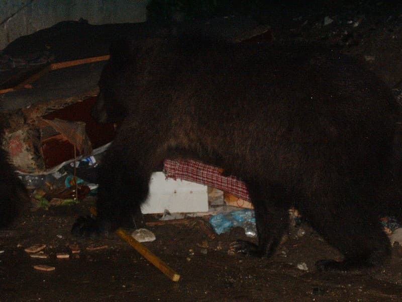 It wasn't long before a bear appeared, quickly followed by her cub. My first reaction on seeing the bears was to want to run over and give them a hug, followed by the realisation that this would be a really bad idea. Bears are rather like kittens, only larger and somewhat more dangerous. The bears bumbled around in a rather dopey way, played with wheelie-bins like they were toys, and gazed around in a confused way whenever there was a loud noise. They behaved more like giant furry toys than potentially dangerous animals.