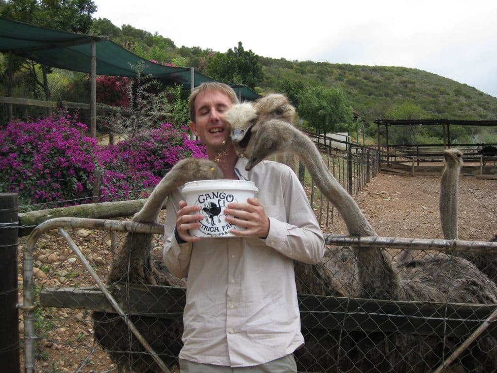 One of the big farming industries in the area is ostrich farming. Ostriches were originally farmed for their feathers, but now are primarily farmed for their meat. I did a tour of a farm and got to pet some ostriches. They are sweet creatures with beautiful long eyelashes and a habit of running around for no apparent reason. They are also pretty stupid, with brains smaller than their eyes.